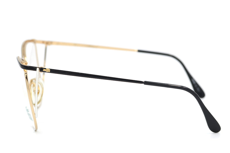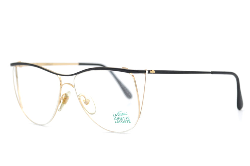We are 100% loving Lacoste 837 in colour 256. Manufactured in France this fine metal frame is really feminine and soft. The brow bar has a fabulous shape to it and the combination of white, gold and black paint works really well. The temporal sides feature the Lacoste crocodile emblem. Also available in full gold on request.