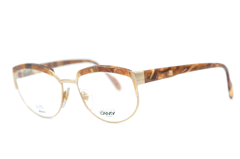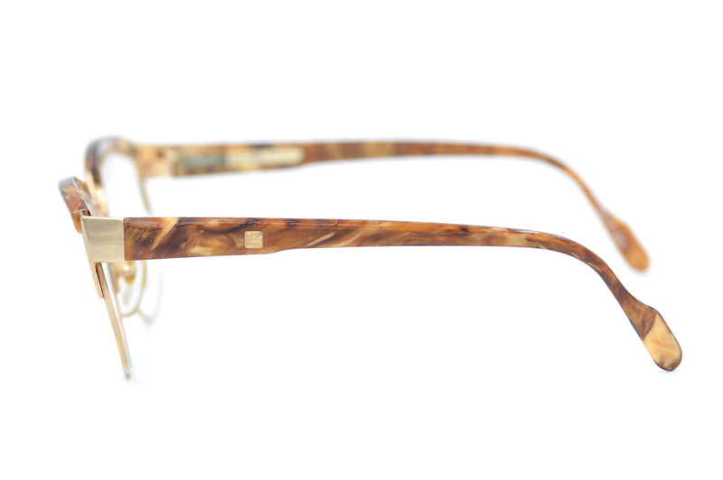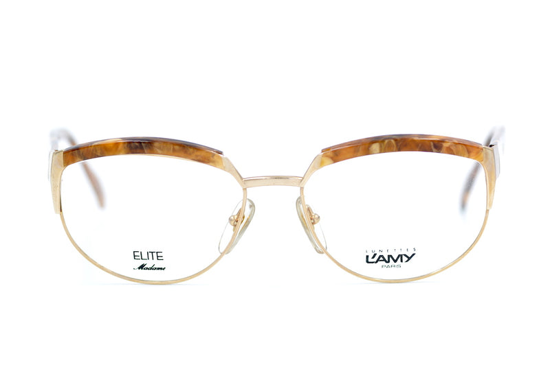 New old stock L'Amy Elite 434 vintage glasses. Manufactured in France, this vintage browline glasses frae is high quality and both strong and durable, designed to last. Polished gold metal is brought to life with brown marbled acetate brow covers and temporal sides. Each side features the L'AMY emblem in gold.