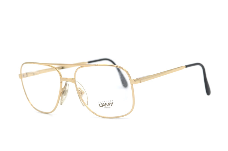 New old stock L'AMY Paris vintage aviators in gold metal. This super trendy frame is is in mint condition and considered a cool unisex style. The frame features a double bar brown and a silicone full bridge, adwding support and increased comfort. Don't be a sheep, shop vintage, shop sustainable, shop style.