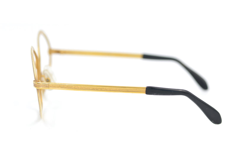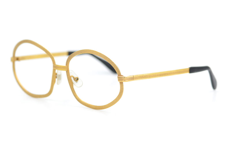 Laura in gold metal is a unique and rare vintage glasses frame. This new old stock has no brand markings making it all the more special. Broad metal rims feature an elegant brushed finish. The temporal sides are mid-set enhancing this off oval shape. Stylish, sustainable eyewear.