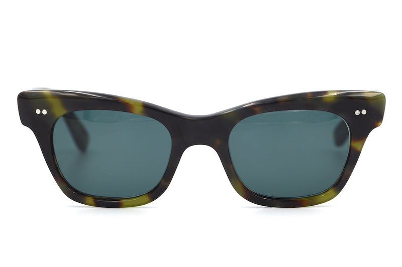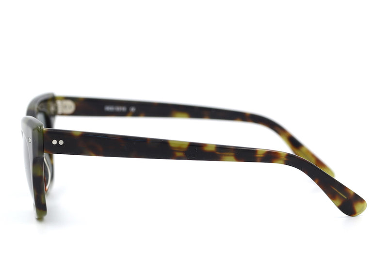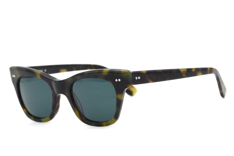 Lou Lou is a cool sustainable sunglasses frame at Retro Spectacle. Made of Italian acetate this fabulous cat eye is not to be missed. Silver pin head rivets can be seen to the front and temporal sides. The frame is fitted with new G15 lenses with 100% UV protection. In excellent condition and suitable for prescription lenses.