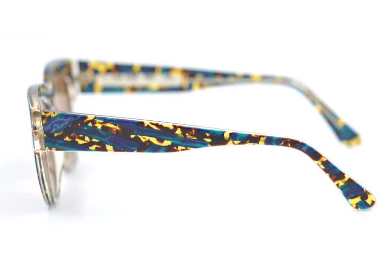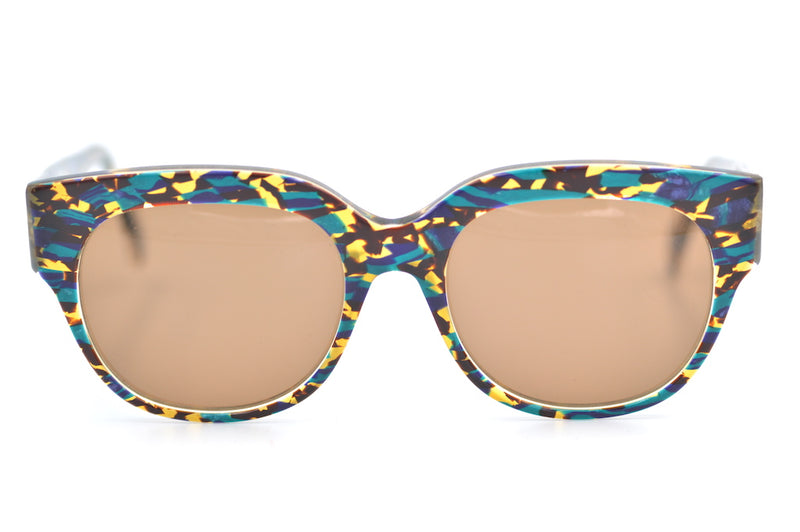 Lova 3088/18 is a new old stock vintage sunglasses frame, manufactured in the 90s. This chunky acetate frame has a mottled finish, with hints of green, blue brown and translucent yellow. Brown lenses provide 100% UV protection. This frame would also work well as prescription sunglasses.