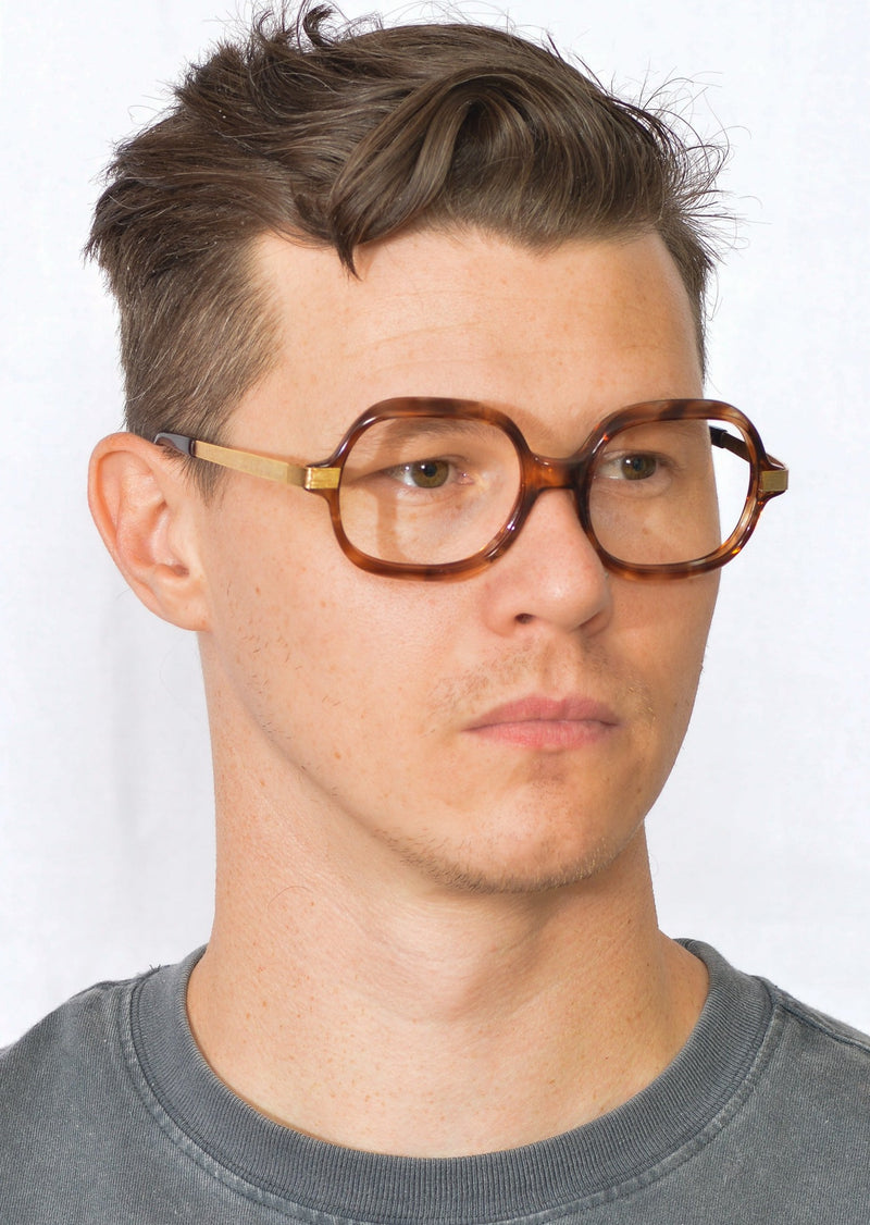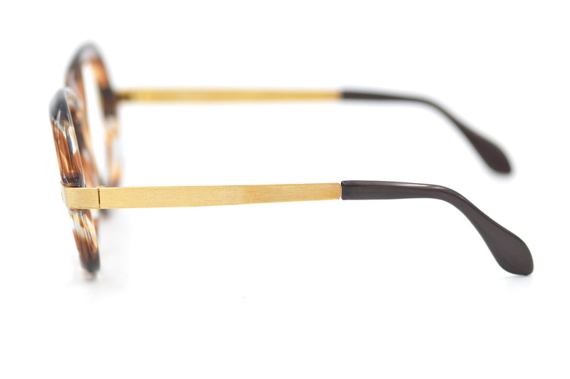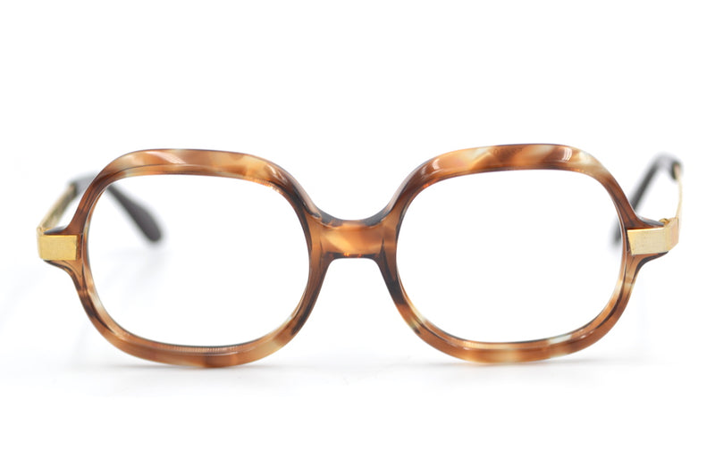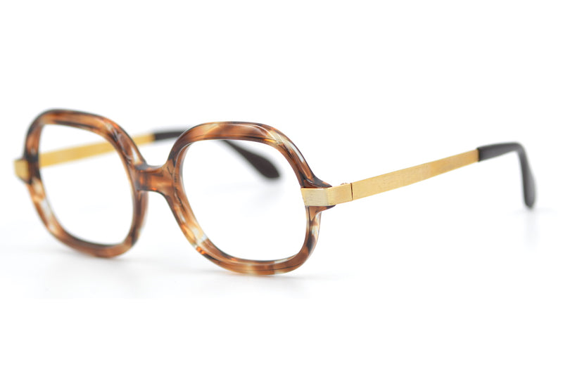 We love this new old stock Maja de Luxe frame by Selecta. Manufactured in France this light amber brown mottled frame features mid-set 12KT gold filled temporal sides, which have a wonderful brushed finished. Strong, durable, well made vintage glasses. A unisex design not to be missed.