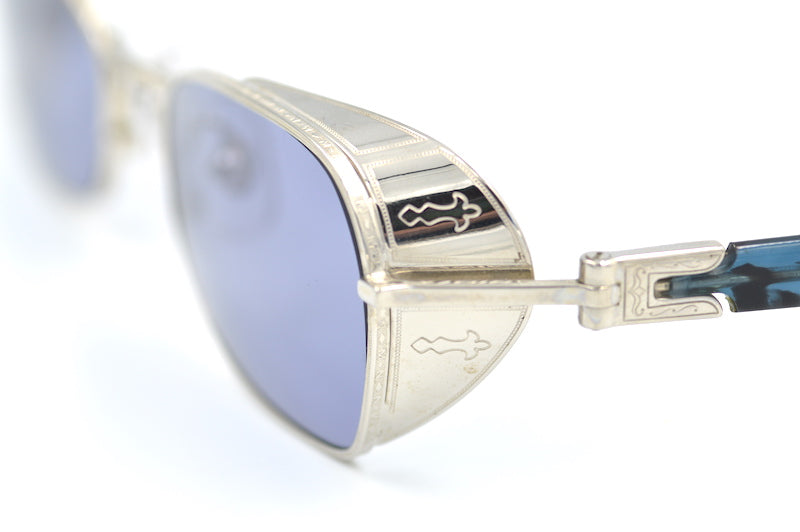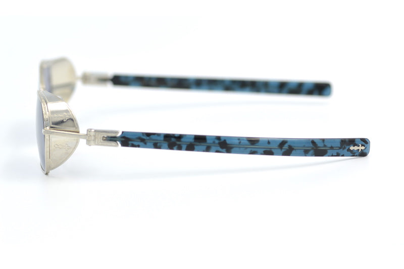 Handcrafted in Japan in the 90s we bring you Matsuda 10625 vintage sunglasses. This rare and unique design is a real show stopper. Phenomenal filigree detail around the lens and silver "eye cup's". The frame features skull grip sides in blue/black mottled acetate. The grey lenses provide UV protection. Luxury sunglasses not to be missed. The brand started producing frames in in 1989.