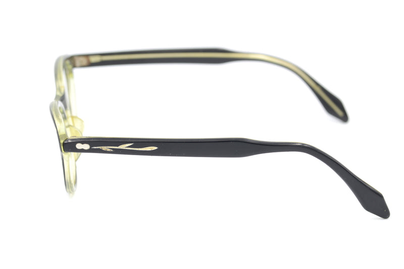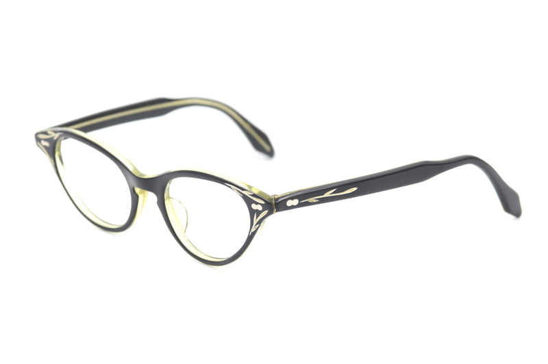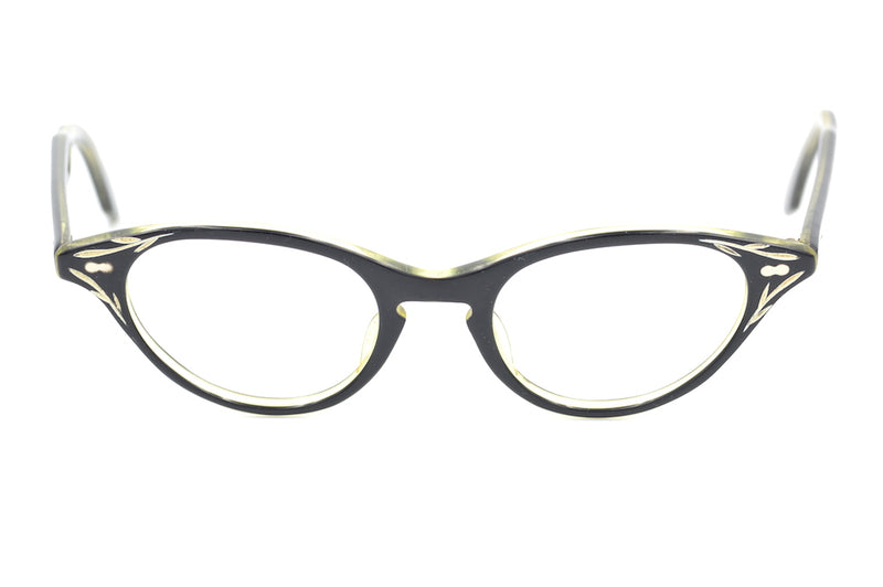 May is an original vintage cat eye frame from the 1950's. In excellent condition and a generous fit compared to many this black acetate frame is full of detail. A keyhole bridge sits centrally in the frame. The front and temporal sides not only feature silver pin head rivets but have fantastic carved detailing in cream, accentuating the sweeping shape and enhancing the cosmetic appearance of these vintage spectacles. A gorgeous frame not to be missed.