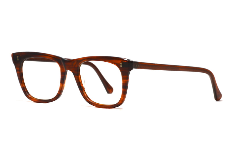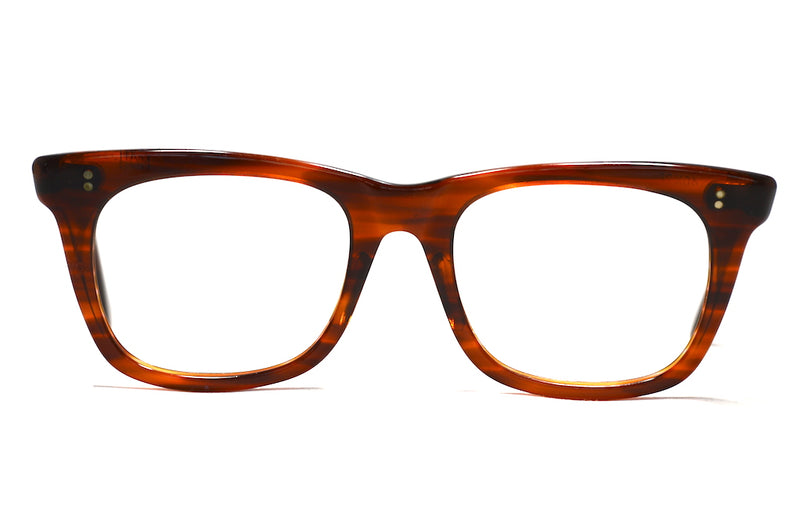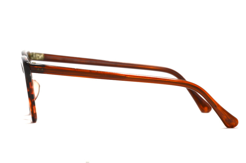 Manufactured in England by Merx we bring you this original Major frame. Stamped with the MXNH for Merx National Health, this frame is classic style and one of our best sellers. Both the front and temple sides feature silver pin head rivets, which support the joints. This unisex frame is in excellent condition with little sign of wear.