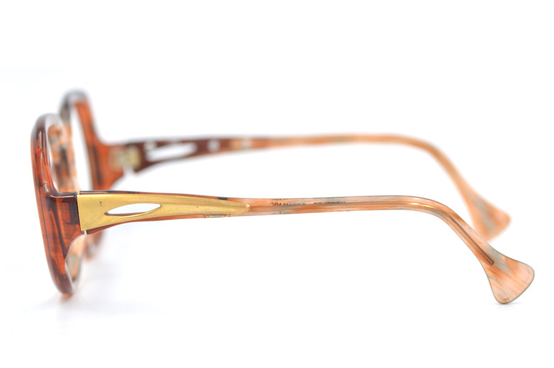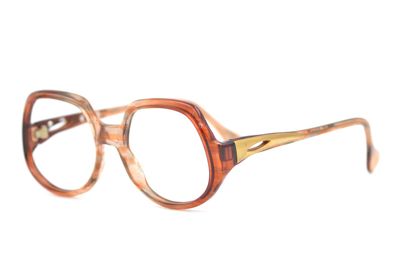 New old stock Metzler 758. Manufactured in Germany this original 70's vintage glasses frame is in superb condition. The mid-set temporal sides and bridge accentuate the 70's vibe. The acetate has a lovely smoke stripe which is more visible at the bridge and gold metal detail can be seen on the temporal side.