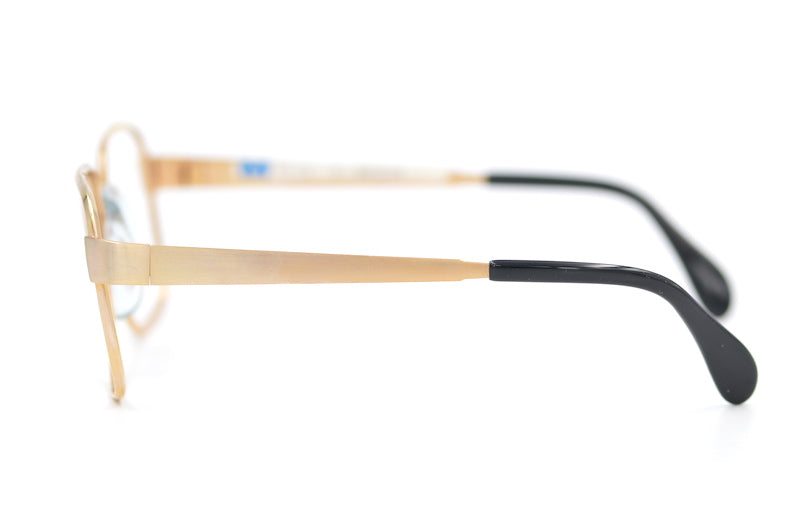 New unused vintage stock, we have Metzler 7636 in pale gold. Manufactured in Germany in the 70s. A wonderful frame, pure class. The front rims are polished, while the bridge and sides have a brushed finish. You can feel the quality of this frame. Designed to stand the test of time, and fitted with comfort nose bridge. Available in a larger size.