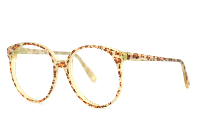 An ever popular design from Michael Selcott we bring you Chelsea in colour 158. This spectacular frame is in full animal print, super sassy. A real 80's vintage glasses frame. This oversized acetate frame is a fabulous shape and has high set etmples. Super stylish, sustainable and on trend. This up-cycled frame is in excellent condition the crystal acetate has yellowed slightly due to age, but works well with the colouring of the frame. Great overall condition.