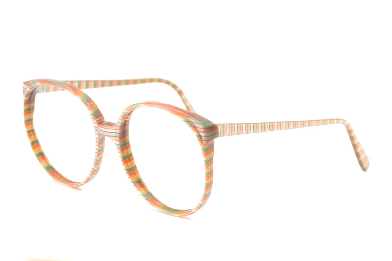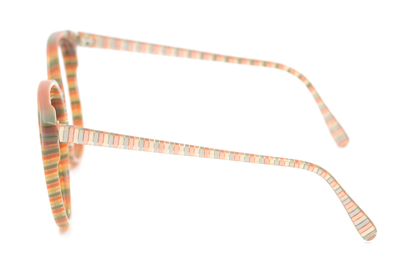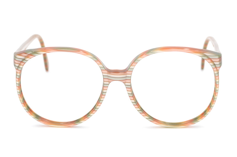 An ever popular design from Michael Selcott we bring you Chelsea in colour 341. This oversized acetate frame features a fabulous and unusual striped effect, in peach, cream and mint. Another stunning oversized frame, which is so stylish right now, as well as sustainable. Ticking all the boxes this frame is in excellent vintage condition, a gem to wear.