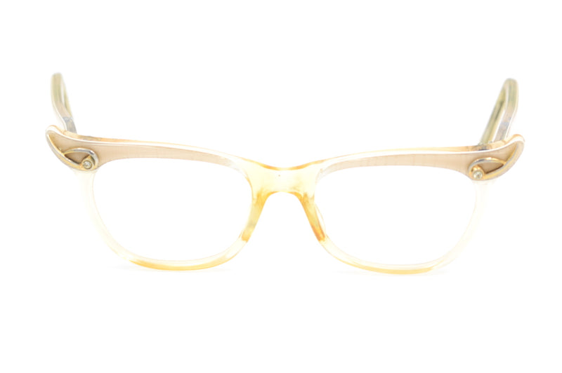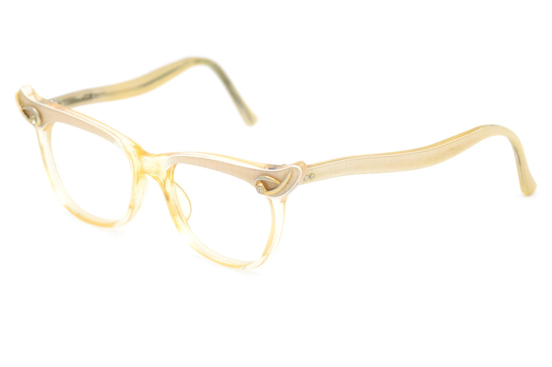In great vintage condition we have this fabulous 1950's original cat eye glasses frame. This acetate frame features a crystal bridge and lower rims, which are complemented with a cream upper brown and temple side. Silver pin head rivets can be seen to the temples, the front features gold and diamante detailing. A popular style in a gorgeous colour.