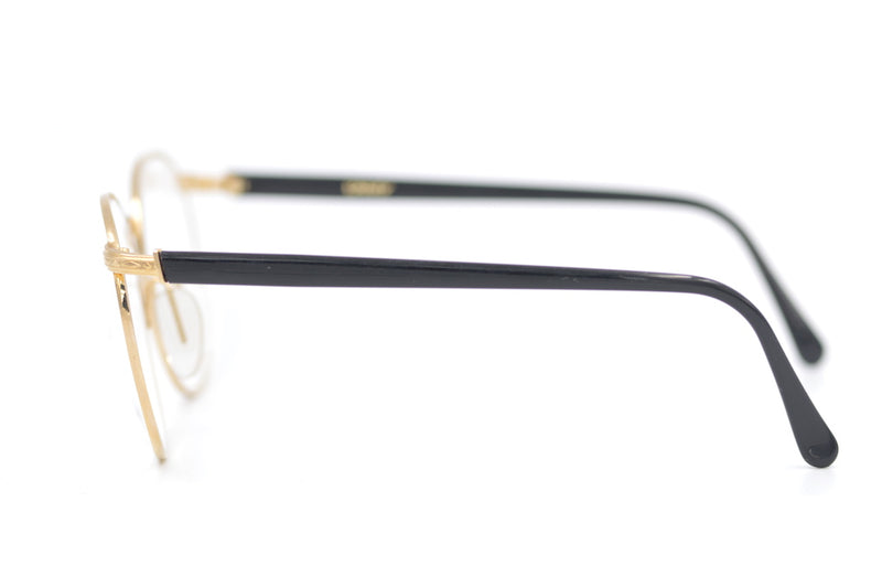 New old stock L'Amy Modulation 1 round vintage glasses. This combination frame features gold polished front rims with black acetate temporal sides. The bridge and temporal edge join have filigree detail. The bridge and sides are set high adding great depth to this stylish, unisex frame.