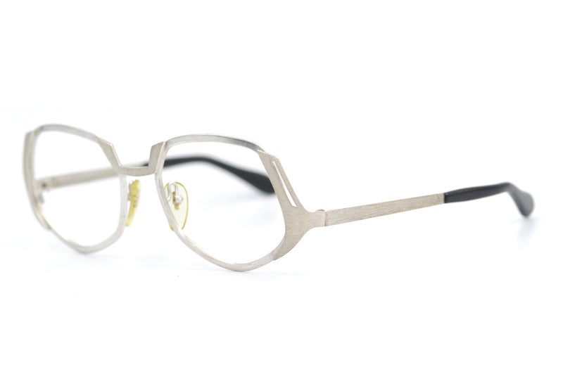 • New old stock Neostyle Boutique 311 vintage glasses. Manufactured in Germany, this unusual shape has a futuristic feel to it. A combination of brushed and polished silver metal is complementary and the temporal sides are set low.  A quirky design from the 70s.