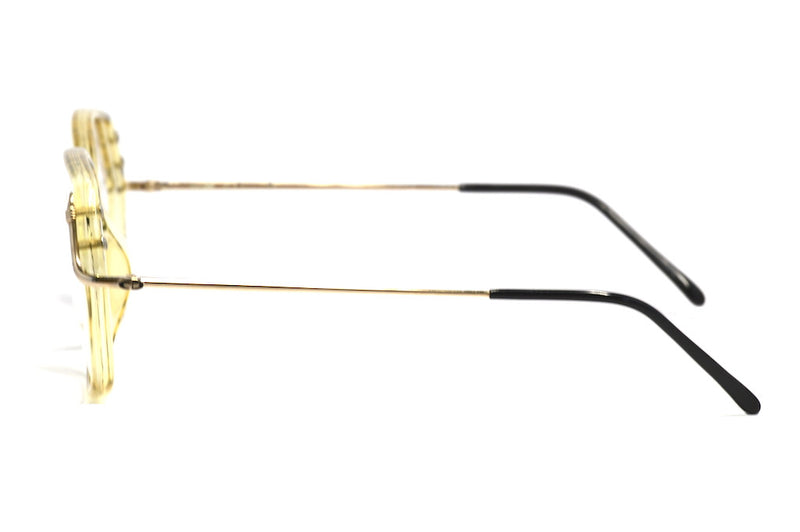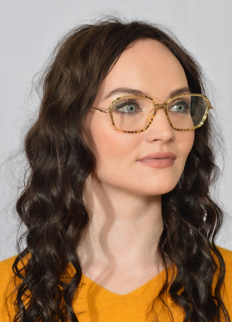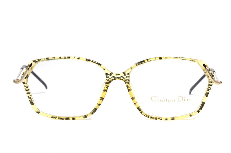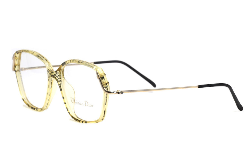Original 1980's new old stock Christian Dior vintage glasses, model 2595, colour 90. Made in Germany this incredibly lightweight frame is made of an Optyl plastic front with fine metal sides, perfect for those who find spectacles heavy or uncomfortable. The light coloured front features black laser lace detailing, and the gold sides attach at the temporal edges, curling round to the side's which feature the CD emblem. The frame is fitted with the original demo lenses.