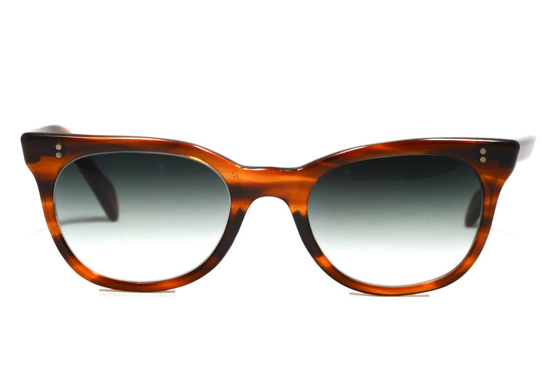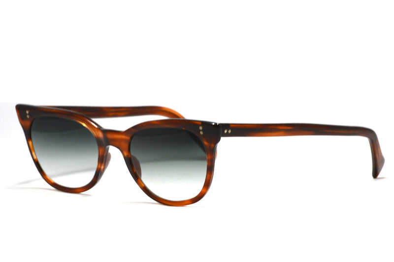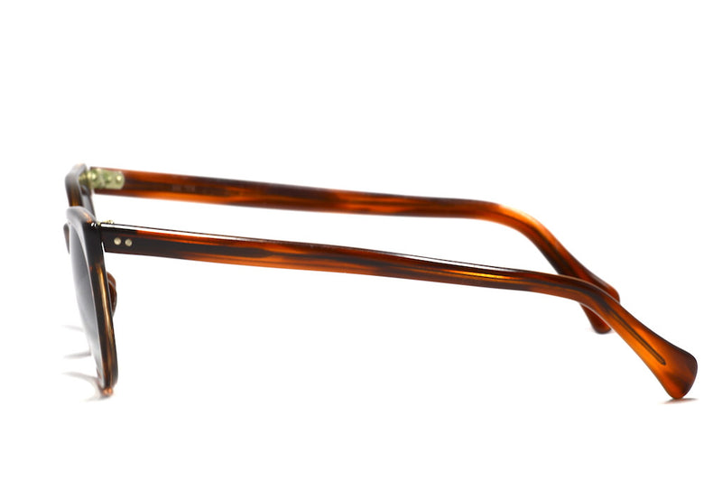 We have customised one of our most popular frames. The NHS 524 vintage glasses frame has been transformed into this fabulous vintage sunglasses frame. The brown tortoiseshell acetate houses new CR39 plastic lenses, which have full UV protection and feature a graduated G15 green tint. The frame is in excellent vintage condition showing light wear and features two silver pin head rivets to the front and sides. This classic/cult frame is a personal favourite and will give you the ultimate vintage sunglasses.