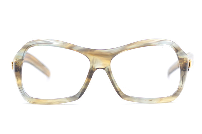 Nina Ricci 0102 rare vintage glasses from the 70s. From the Nina Ricci Signature range. This stunning design is oversized, with wonderful transparent smoke mottled acetate. The Nina Ricci emblem can be seen on the temporal sides. If you are looking for the coolest 70s glasses then look no further. New unused vintage stock handmade in France in the 70s. Nina Ricci was founded in Paris 1932 and the timeless styles are loved across the globe. Shop the best selection of mens 70s glasses online at Retro Spectacle.