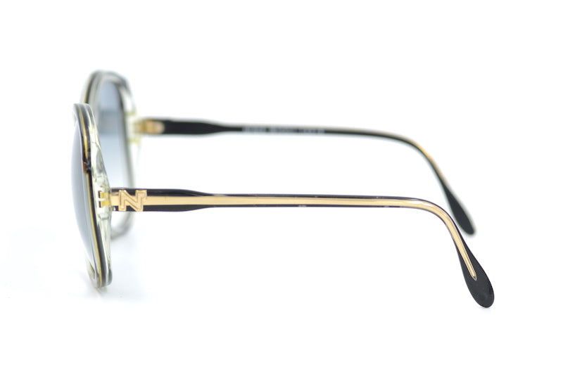 New old stock Nina Ricci 1313 vintage sunglasses in colour MNO. Oversized black acetate sunglasses with hand painted gold outline on the front. The temporal sides feature the Nina Ricci emblem. The grey graduated lenses provide 100% UV protection. A super stylish pair of designer vintage sunglasses. Also available in brown. Shop the best selection of women's 70s sunglasses online at Retro Spectacle.