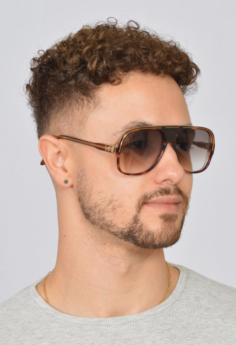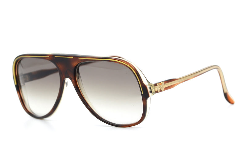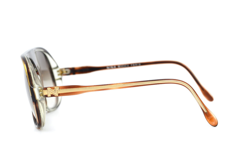 So we have this stunning Nina Ricci 1316 vintage sunglasses frame in colour MO52. This super stylish pair of vintage sunglasses is new old stock, in superb condition. The frame is fitted with brown graduated lenses absorbing 100% UV. The temporal side feature the Nina Ricci emblem. Hand made in France, this pair of vintage sunglasses are just fab. Prescription lenses available with this frame.