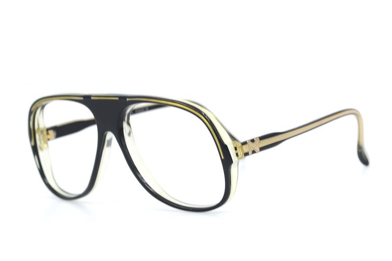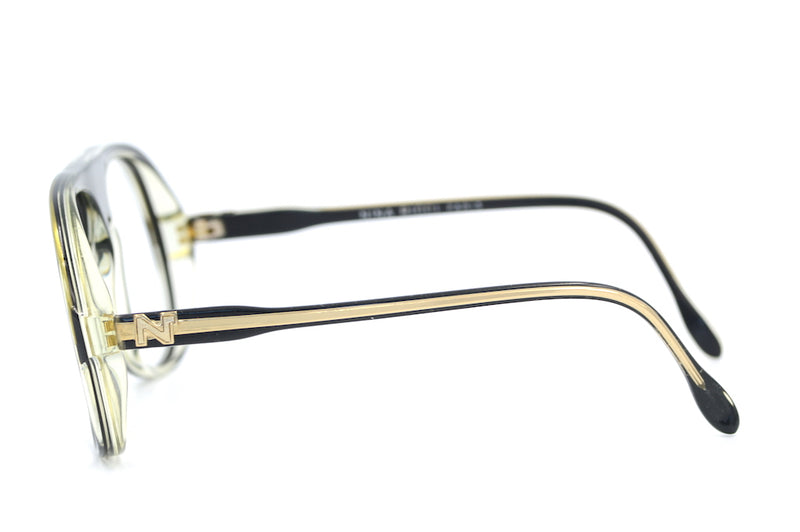Nina Ricci 1316 vintage glasses frame in colour MNO. Handmade in France, this new old stock, high quality frame is simply divine. The black acetate features a gold wire detail running through the top brow.. The reinforcement in the temple sides can be seen in gold and is finished nicely with the Nina Ricci Emblem. A super stylish frame not to be missed. Custom lenses from £29.00.
