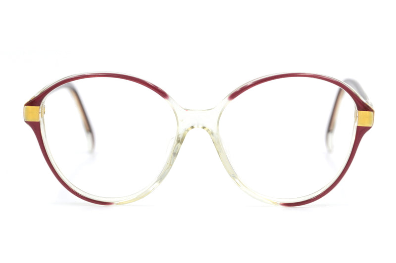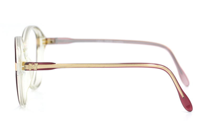 New old stock Nina Ricci 160 vintage glasses in colour NOPB. The frames feature the Nina Ricci emblem to the temporal sides and were hand made in France. This 80's frame is crystal acetate with red and gold detail. A really soft feminine shape. Stylish, sustainable vintage designer glasses from the French fashion house.