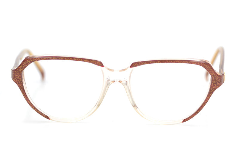 Nina Ricci 1760 vintage glasses in colour GRN. Hand made in France in the 80s. Feminine cat eye shape, in crystal and red acetate with the Nina Ricci emblem print. New unused vintage stock.