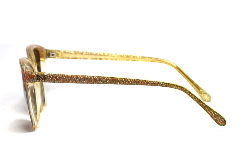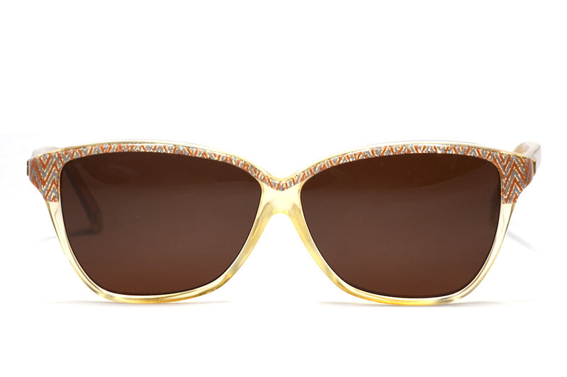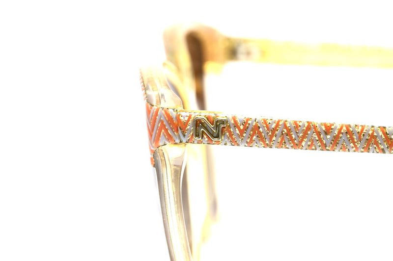Nina Ricci is a fashion house which was founded in 1932. Here is an original 1980's Nina Ricci 1762 vintage sunglasses frame with brand new CR39 brown lenses with 85% abs and 100% UV protection. This beautiful stylish oversized frame has a crystal lower rim and the most stunning orange, gold and pale blue weaved pattered upper rim and sides. The sides are a hockey end and feature the Nina Ricci emblem. The brown lenses bring the brow line pattern to life. In excellent vintage condition this designer vintage sunglasses frame is not to be missed.