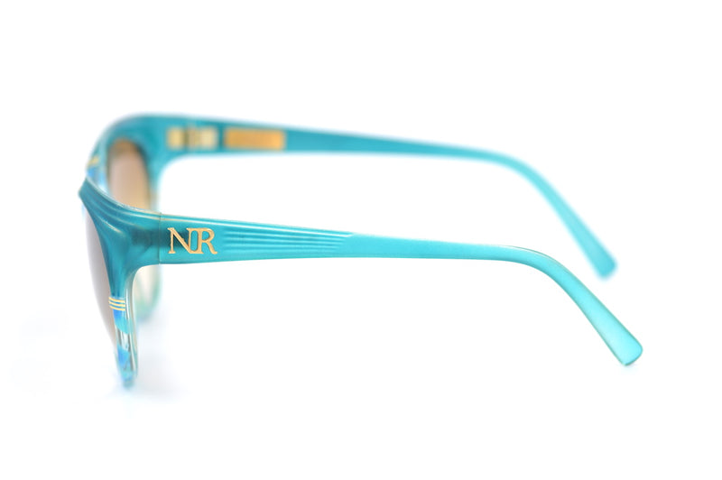 We really love Nina Ricci 3001 in colour 3014. This bright vibrant turquoise frame, features a mix of matte and marbled effect acetate. The temporal sides feature the Nina Ricci Emblem. Brown graduated lenses provide 100% UV protection. Manufactured in France.