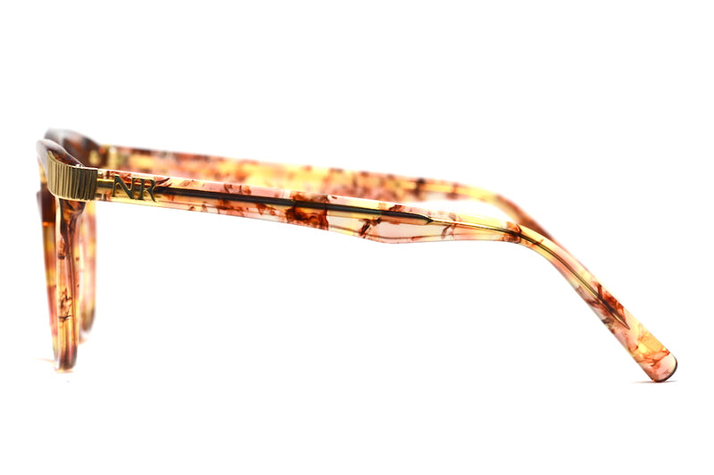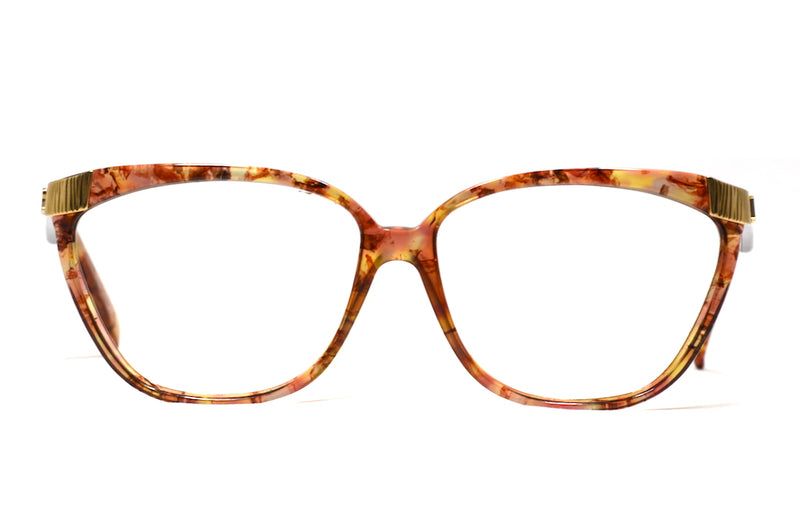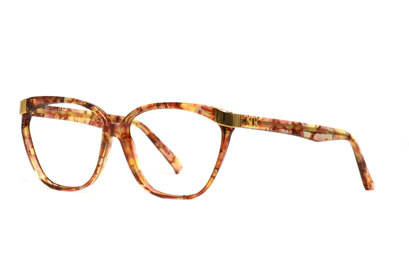 Nina Ricci 3029 col 8411 is a stylish upswept acetate frame from the French fashion house. Manufactured in France, this high quality frame is in excellent condition. Perfect for this season, the autumnal colours feature a marbled effect. The temporal corners feature gold metal detailing and the temporal sides feature the Nina Ricci emblem.