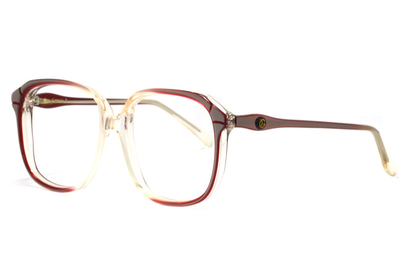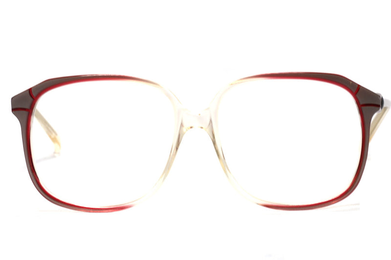 Here we have Verity, the ladies Oliver Goldsmith oversized square vintage glasses frame. Oliver Goldsmith is a family firm, run since 1926 and adored by celebrity wearers including Princess Diana, Audrey Hepburn and Kate Moss, who could resist the oppertunity to own and wear this amazing original vintage piece of eyewear. This acetate frame has a crystal bridge which extends to a silver temporal rim and side with red inside and edge detailing. The OG emblem can be seen on either side in gold. The inside right has the engraving 'Oliver Goldsmith', the inside left 'Verity - Made in England'. Quality, elegance and comfort were key in all OG designs and this frame is no exception. In excellent vintage condition this frame could also look spectacular as sunglasses, which we could customise for you to create a unique and bespoke pair of sunglasses.