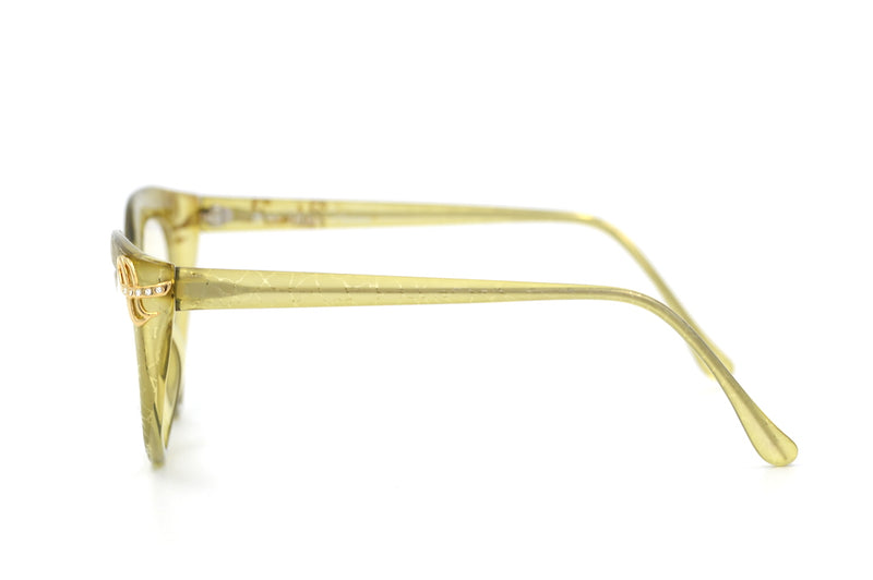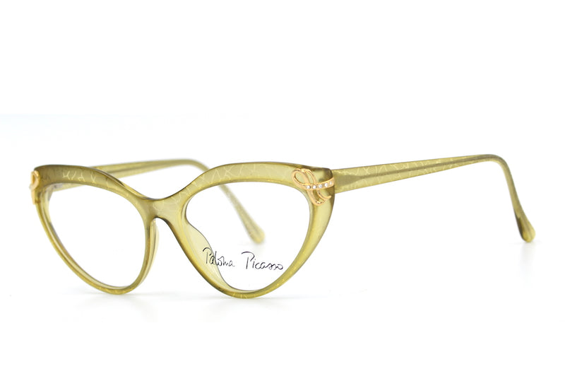Paloma Picasso 3720 is one of the most beautiful cat eye frames we currently stock. With everything proportionally correct, this frame is mind blowing. Manufactured in Germany, the frame is made of Optyl, a lightweight, durable and hypoallergenic material. The frame is a transparent light green colour, which features the signature crack mottling that features on many of Paloma Picasso's frames. The right side temple features the Paloma Picasso signature in gold. The front temple edges feature stunning gold metal work to which five diamanté's are set either side. This frame is not a bold in your face cat eye, its subtle, sophisticated, elegant and covered in detail. A Retro Spectacle favourite.