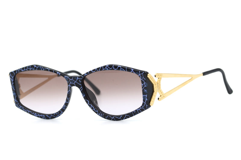 Paloma Picasso 3730 new old stock vintage sunglasses in colour 50. Manufactured in Germany, gold metal sides accompany the Optyl front, which has a blue crackle glaze. The lenses have 100% UV protection and a brown graduated tint. Orignal case included. Stylish vintage sunglasses from Paloma Picasso.