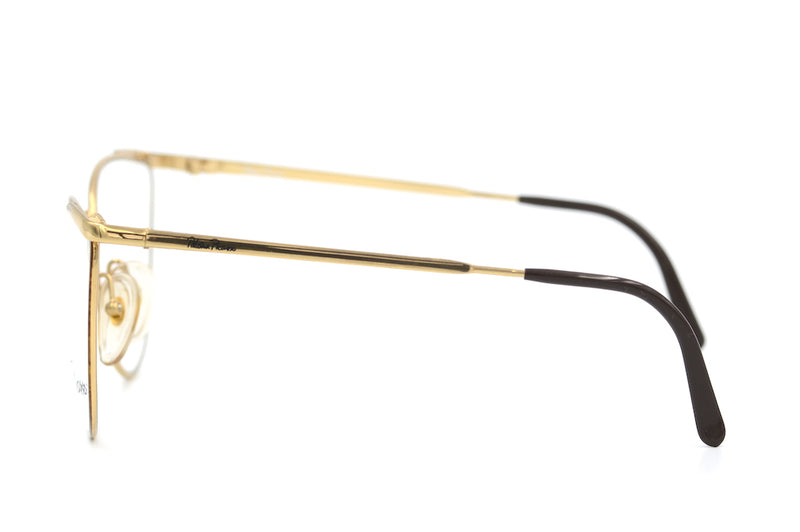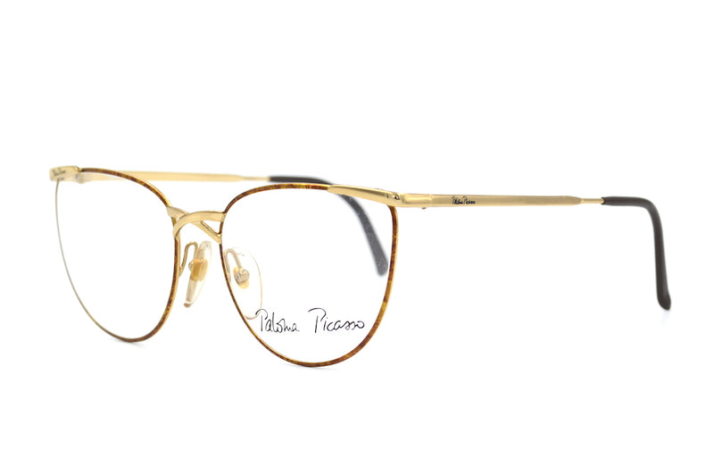 New old stock Paloma Picasso 3792 vintage glasses in colour 41. Simplistic yet stylish, these lightweight polished gold frames have a brown mottled finish to the front rims. The bridge is made up of branding from Paloma Picasso and the signature can be seen to the top right front temporal edge and the left temporal side. A feminine frame with a slight upsweep in the temporal corners. A stylish, delicate frame from Paloma Picasso.