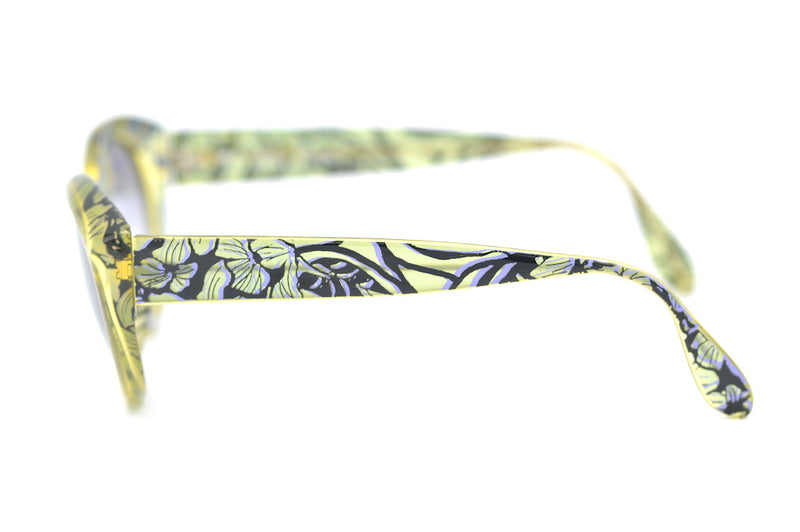 New old stock Paloma Picasso 3807 vintage sunglasses in colour 50. A feminine design with floral print. The frames are made of Optyl, a lightweight, durable and hypoallergenic material. The lenses feature a grey tint and have 100% UV protection. The frame has a pale yellow and black design, with lilac highlights to the side. The right temporal side features the Paloma Picasso signature. Feminine vintage sunglasses not to be missed.