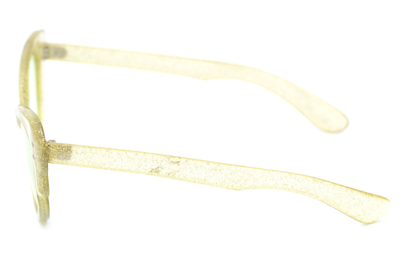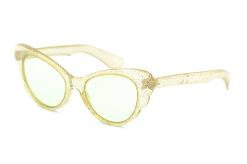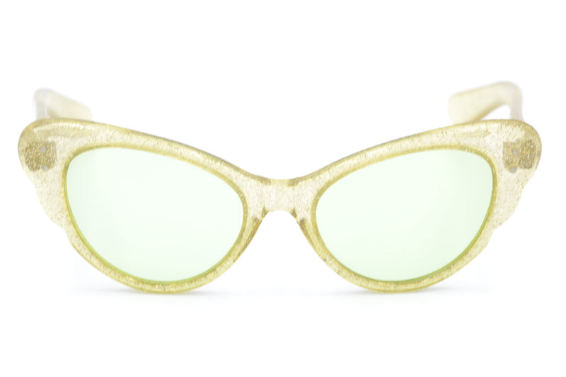 Papillon is a beautiful 1950s cat eye frame which has silver glitter flecks throughout. This petite frame is in excellent condition and is fitted with its original lenses. The original lenses are also in excellent condition with a few minute scratches, this is because the high quality lenses are made of glass. The lenses feature a light green tint which absorbs 30% of light, and do not have UV protection, make the present lenses more of a fashion statement than sunglasses. Pin head rivets can be seen to the front and temporal sides. The sides are a skull grip fit, designed to hug your head as oppose to curling behind the ear.