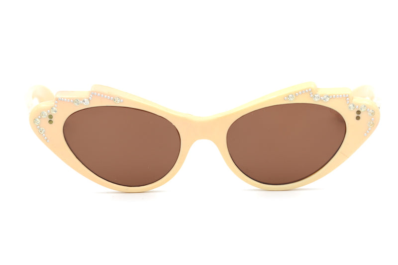 It's safe to say we adore Patricia, this original 1940s vintage sunglasses frame. Made of peach coloured acetate this cat eye frame features a jagged cat eye shape to the upper front rim. This edge is embellished with diamante and stud detailing. All diamantes are present, with just one tiny stud missing which is only visible on very close inspection. We have restored this frame and fitted it with brown optical lenses which absorb 85% of light and have UV400 protection. There is a little bit of damage visible to the left temporal side, which can be viewed on the pictures below and there is a small patch of discolouration to the right temple side. These are minor flaws and do not affect the durability or wearability of this frame, do not let this detract from what is a beautiful and original pair of vintage sunglasses. This frame is suitable for prescription lenses to be fitted.