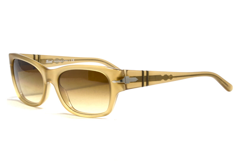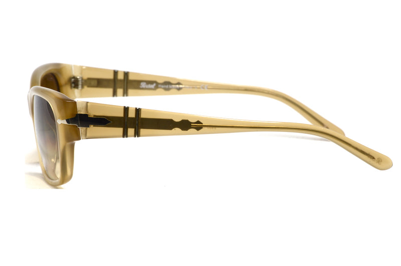 Persol 2955-S in colour 197/51. This typically styled Persol frame is a classic and features the high quality craftsmanship thats expected from the brand, as these frames are hand made in Italy. The frame features the Persol sprung side, which is a great piece of engineering. The honey coloured acetate is accentuated by the brown graduated tint lenses. The right lens features the Persol signature, they have a back anti reflective coating and the lenses are made of glass, again signifying quality. The frames and lenses are both in excellent condition with little to no sign of wear. The original case is not supplied, but a Retro Spectacle case and cleaning cloth will be provided.