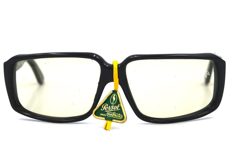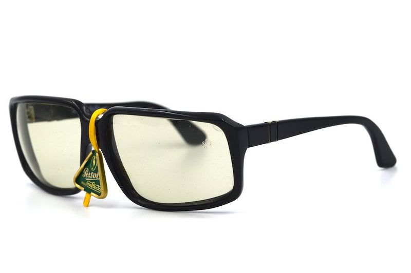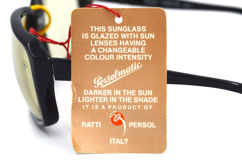 Manufactured in Turin Italy in the 80s, we have this new old stock Persol Ratti Sun Shine 6270/I in black. This super rare frame comes with the original brown case, which was also manufactured in Italy. The frames feature the Meflecto technology (1938), creating a comfortable fit. The lenses are made of glass and feature the Persol engravings at the temporal edge on both lenses. The glass lenses are transitions, changing colour in UV light. They absorb from 30% to 70% of light. This pair of vintage Persol sunglasses is in superb condition, with original tags and cases. A collectors frame not to be missed.