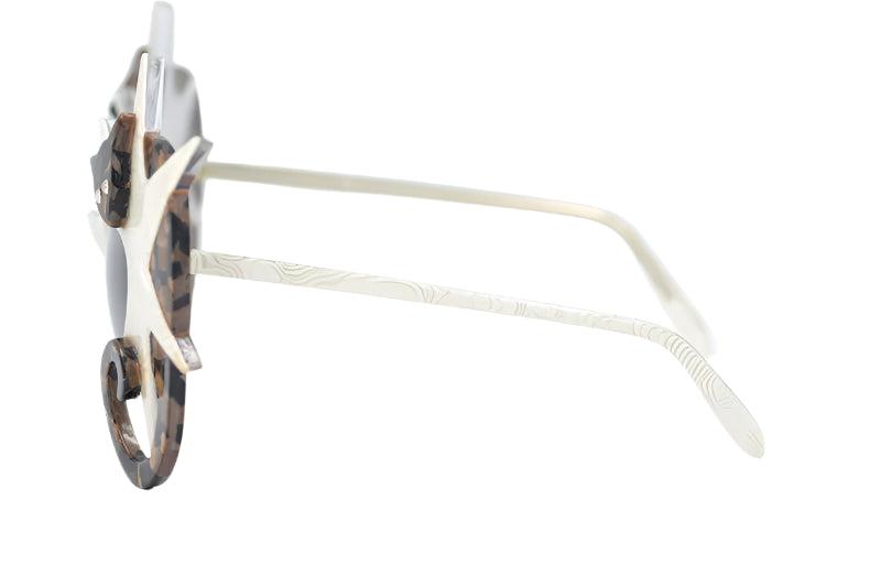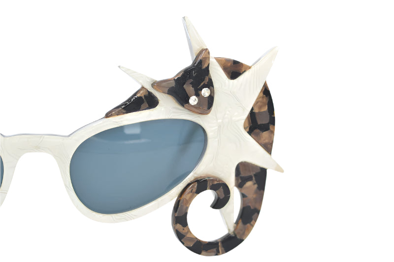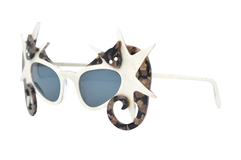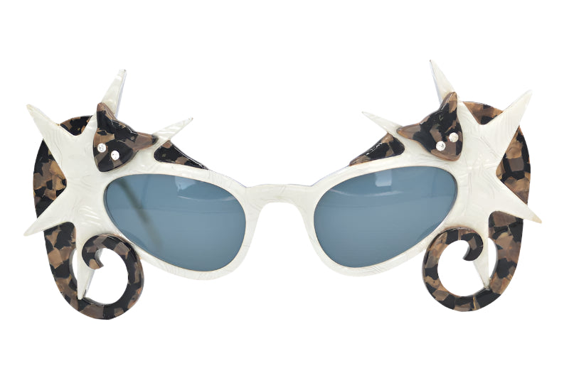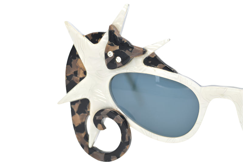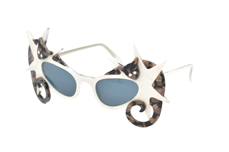 Hello Possums! Handmade in England, Possums was manufactured in 1970 and was one of the earlier frames in the Fantasy collection. This frame has been seen on Dame Edna Everage, part of her "face furniture" collection. This white marbled acetate frame features star like shaping to the temporal edges, to which possums lay, with their curly tails and diamante eyes. This frame is currently fitted with grey sun lenses. This frame is in excellent condition, a true collectors frame.