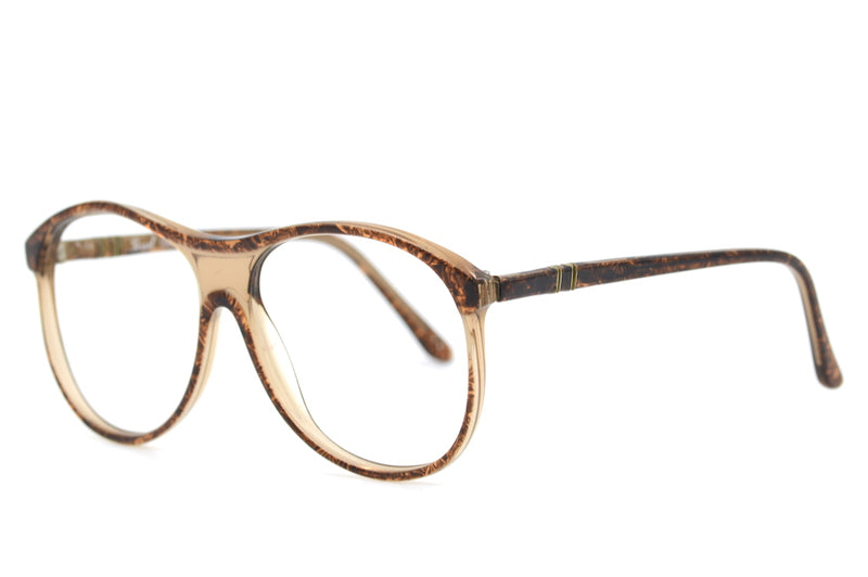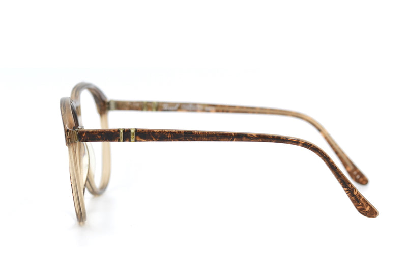 Original vintage Persol Meflecto frame manufactured in Italy. This rare and unusual Persol frame was branded on the inside for the Al Bashawri Optics in Saudi Arabia, which continue to trade to the present day. It has the Meflecto technology in the temporal side and the brown mottled pattern follows the rims. This is a fabulous frame not to be missed, with a real sense of 70's style.