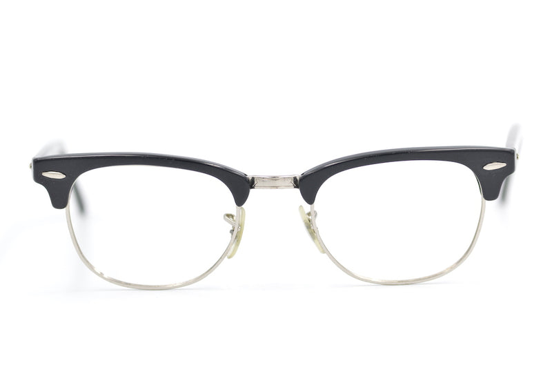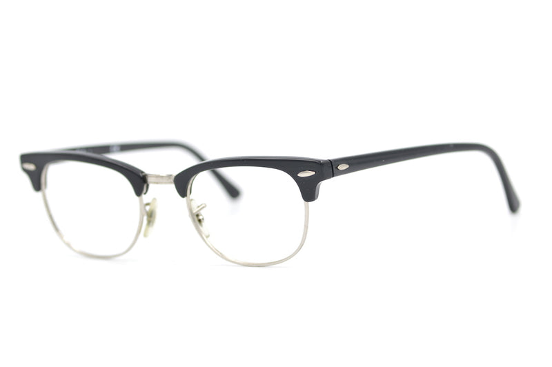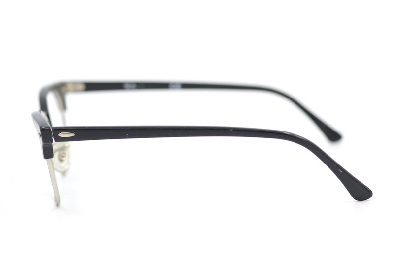 RayBan 5154 in colour 2000. Get the Malcolm X style with this brow-line RayBan classic. The browns and temporal sides are made of black acetate and feature silver rivet detail. The bridge and lower rims are polished silver metal. This up-cycled frame is in great condition showing very little sign of wear.