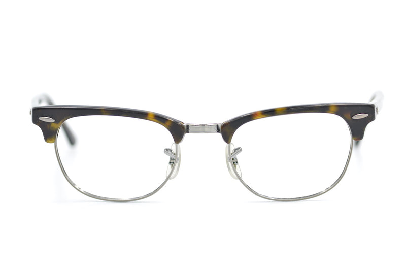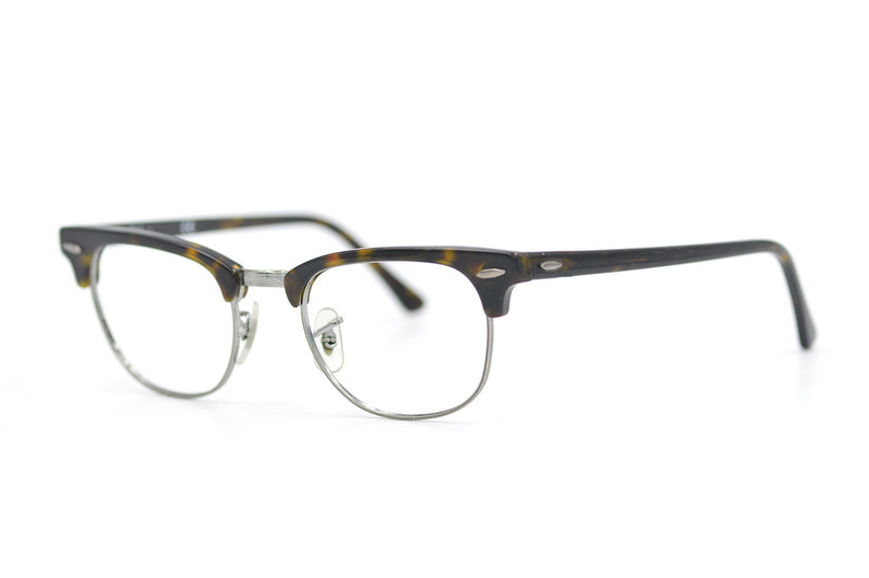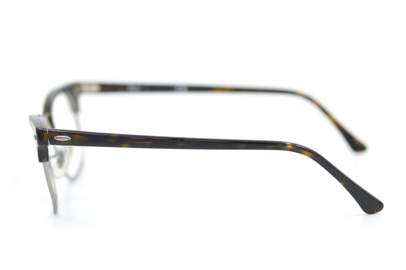 RayBan 5154 colour 2012 is the classic Clubmaster model from RayBan. The frame comprises of a silver polished bridge and lower rims, with brown mottled acetate brow covers and temple sides. Classic rivet detailing can be seen to the temporal front and sides. Toggle pads are fitted to the frame allowing adjustment to the bridge, for a more personalised fit. This frame is in great condition.