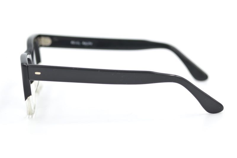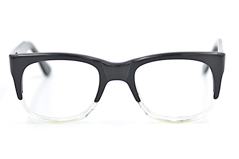 Revel Ralph 1960's mens vintage glasses. A classic style, Revel Ralph glasses remain a popular choice. The black and crystal acetate front is supported by black temporal sides with silver rectangular rivet detailing. Five charnier hinges demonstrate the strength and quality of the frame. Good refurbished vintage condition. Rockabilly vintage glasses at Retro Spectacle. The best selection of mens retro glasses online at Retro Spectacle.