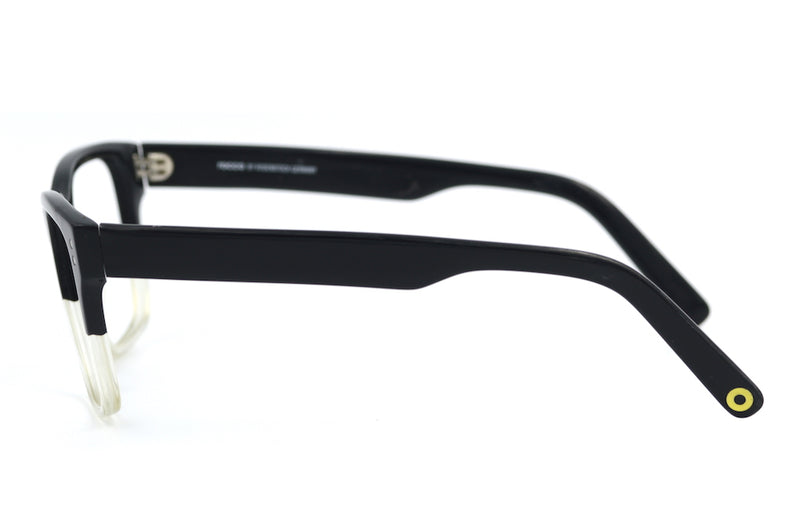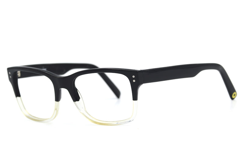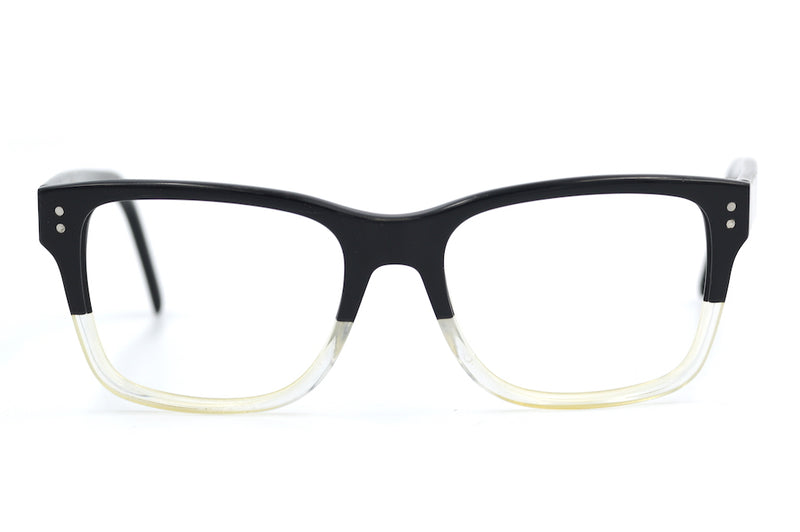 Up-cycled Rodenstock RR408. This strong and durable frame is in good condition with sign of light wear. Designed around vintage frames from the past, it features a black to crystal transition in the acetate. Silver pin head rivets can be seen at the front of the frame. All spectacles supplied with a brand new spectacle case and a Retro Spectacle microfibre cleaning cloth.