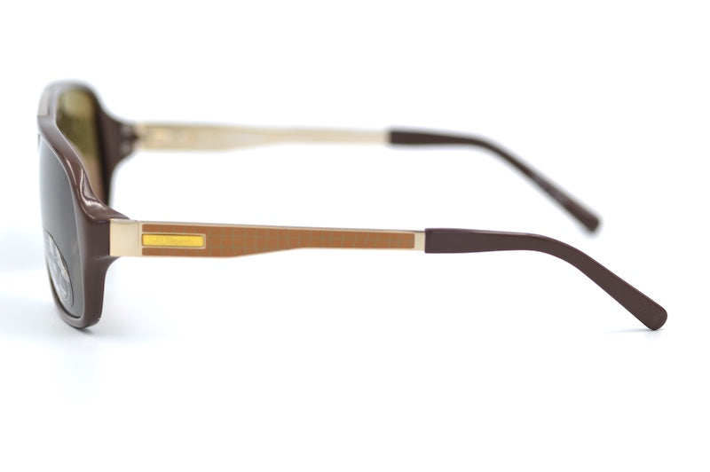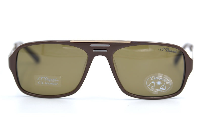 S.T Dupont 7074U men's designer sunglasses. This high quality frame was crafted in Japan using the finest materials. Brown polarised lenses provide 100% UV protection, a back surface anti reflection coating and the S.T Dupont signature. The metal sides feature enamel detail with the S.T Dupont signature. These stylish frames are a large fit. This brand was worn by Brad Pitt in the F1 movie. Men's luxury vintage sunglasses. The brand was created in 1872 by Simon Tissot Dupont.
