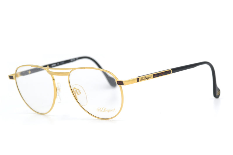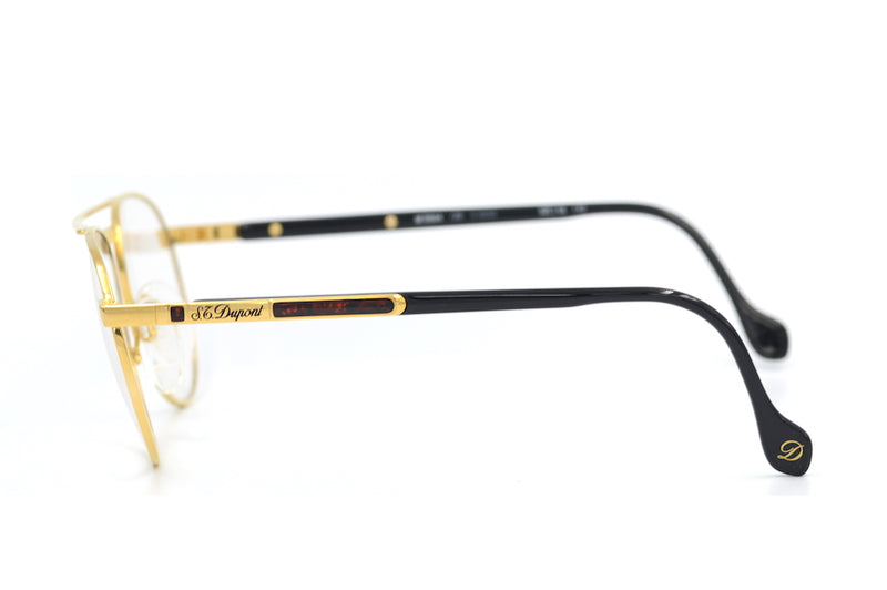 S.T. Dupont D004 vintage glasses in colour 6053. Luxurious, sleek and stylish this vintage glasses frame is not to be missed. 23KT Gold plated, manufactured in Austria, it has been handmade to original designs. It is a limited edition and is individually numbered to guarantee its unique quality. The front is made gold with brown enamel detail to the edge and temporal sides. The temporal sides black with gold plated and enamel detail. The brand was created in 1872 by Simon Tissot Dupont. Theses luxurious spectacles are a real investment piece for the discerning gent. Original authenticity card provided.