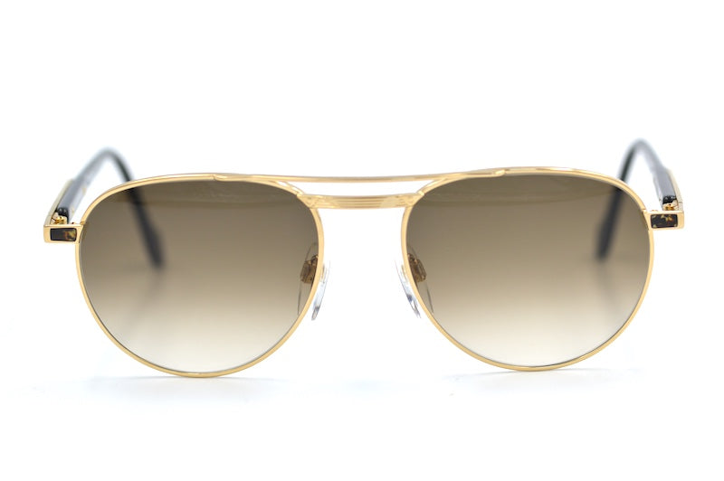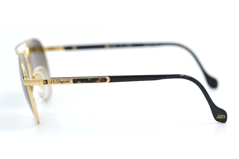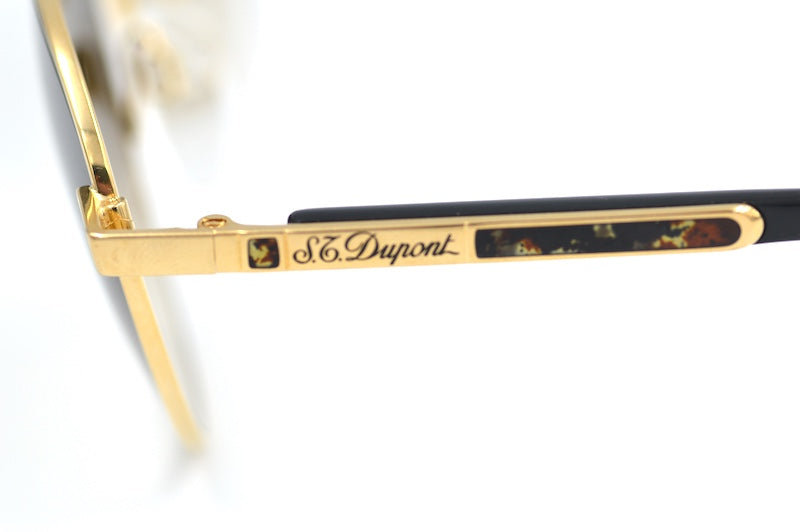 S.T. Dupont D004 vintage sunglasses in colour 6052. Luxurious, sleek and stylish, this brand was worn by Brad Pitt in the F1 movie. 23KT Gold plated, manufactured in Austria, they has been handmade to original designs. S.T Dupont no longer make eyewear, making these highly sought after frames all the more desirable. Only limited numbers left. This frame is a limited edition and is individually numbered to guarantee its unique quality. The front is made gold with brown mottled enamel detail to the edge and temporal sides. The temporal sides black with gold plate and enamel detail. Brown graduated lenses provide 100% UV protection and help to create these luxury sunglasses. The brand was created in 1872 by Simon Tissot Dupont.