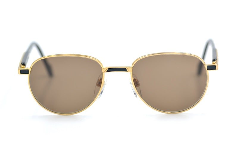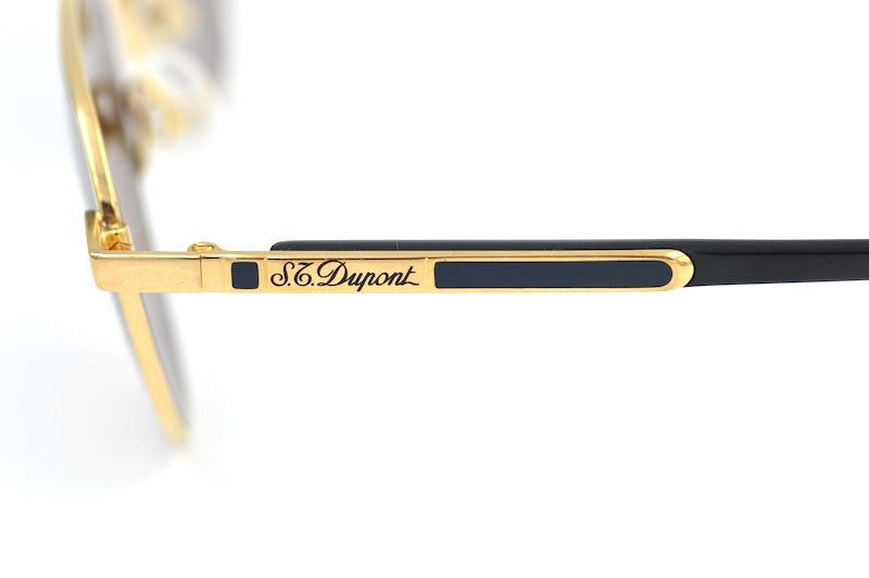 S.T. Dupont D005 vintage sunglasses in colour 6052. Luxurious, sleek and stylish, this brand was worn by Brad Pitt in the F1 movie. 23KT Gold plated, manufactured in Austria, they has been handmade to original designs. It is a limited edition and is individually numbered to guarantee its unique quality. The front is made gold with navy enamel detail to the edge and temporal sides. The temporal sides black with gold plate and enamel detail. Brown lenses provide UV-385 protection. Men's luxury vintage sunglasses. The brand was created in 1872 by Simon Tissot Dupont.