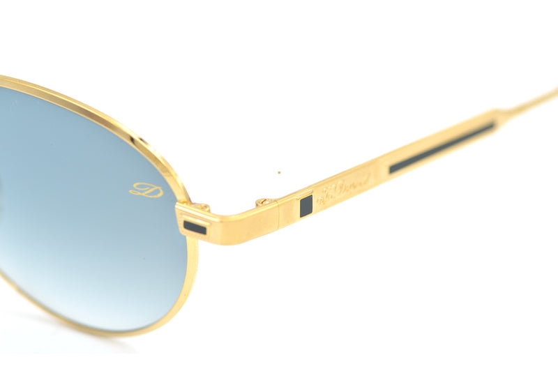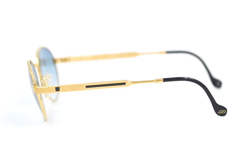 Step back and take a breath to appreciate this magnificent S.T. Dupont vintage sunglasses frame, model D088 in 23KT gold plate. Luxurious, sleek and stylish this vintage designer sunglasses frame was manufactured in Austria. Handmade to original designs. A high quality frame, which features the original grey graduated lenses, with the S.T Dupont emblem and offering 100% UV protection. The S.T Dupont frames have a Cartier like feel. A combination of matte and polished gold is visible with the classic S.T Dupont lacquered detail in black. This frame comes with its original authentication card. The brand was created in 1872 by Simon Tissot Dupont and specialises in the sale of luxury goods. Theses rare and attractive spectacles are a real investment pair for the discerning gent.