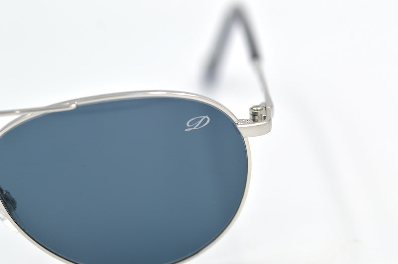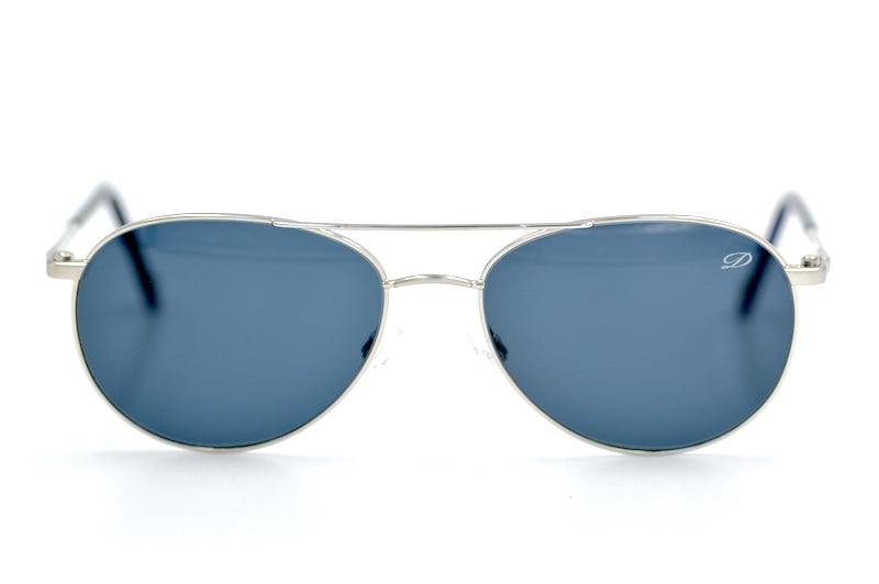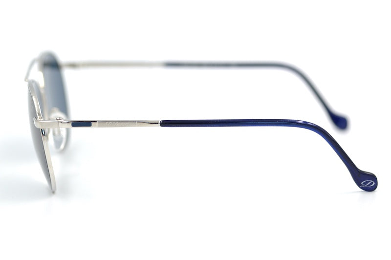 Only three left - Step out in style in S.t Dupont D127/00 vintage sunglasses. Luxurious, sleek and stylish, this brand was worn by Brad Pitt in the F1 movie. 23KT Gold plated, manufactured in Germany, they has been handmade to original designs. These silver oval shaped frames feature a double brow bar for strength and style. Blue acetate side covers match the blue enamel detail on the sides. Grey lenses provide 100% UV protection and have the Dupont emblem on the left lens. S.T Dupont no longer manufacture eyewear so stocks are running out. Men's luxury vintage sunglasses. The brand was created in 1872 by Simon Tissot Dupont.