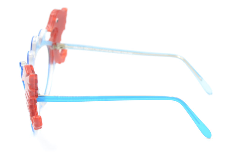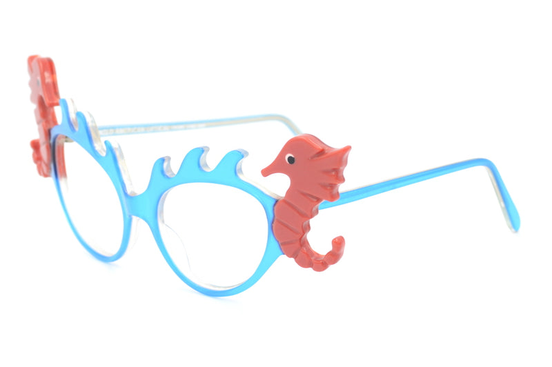 Part of the Anglo American Eyewear, Fantasy collection we bring you Seahorses. It does not take much to wonder where the name came from. This striking blue acetate frame features two stunning seahorses and the upper rim resembles waves in the ocean. A true collectors piece, but also suitable to fit prescription lenses, this frame is a conversation starter. The frame is in excellent condition, manufactured in England.